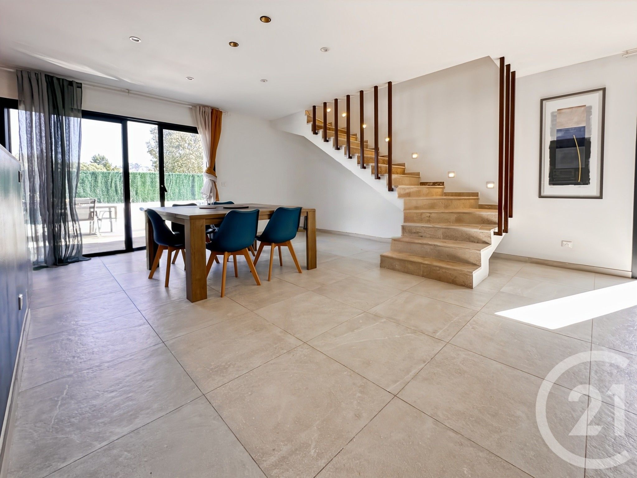 Dès l'entrée, le ton est donné par un vaste espace de vie, particulièrement lumineux, où le salon et la salle à manger bénéficient de volumes harmonieux et bien définis. La cuisine ouverte, entièrement aménagée et équipée, s'intègre parfaitement à cet ensemble convivial.